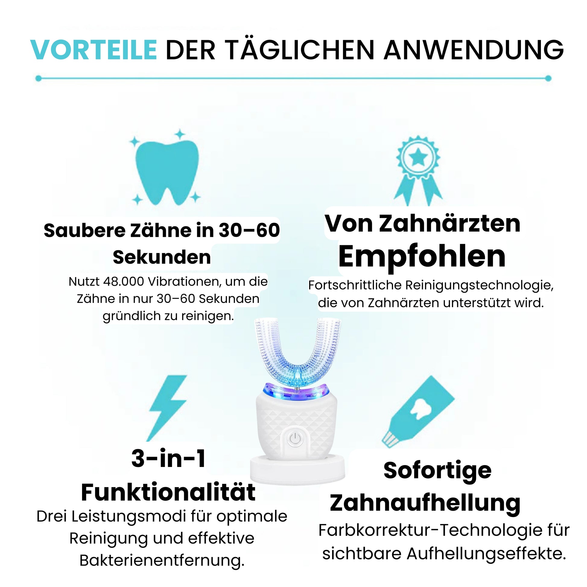 - 360° Rundum-Reinigung: Jede Zahnoberfläche wird gleichzeitig gereinigt – gründlicher und effizienter als mit einer herkömmlichen Bürste.